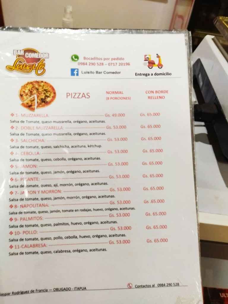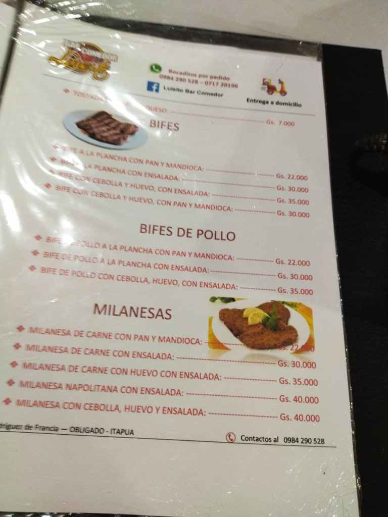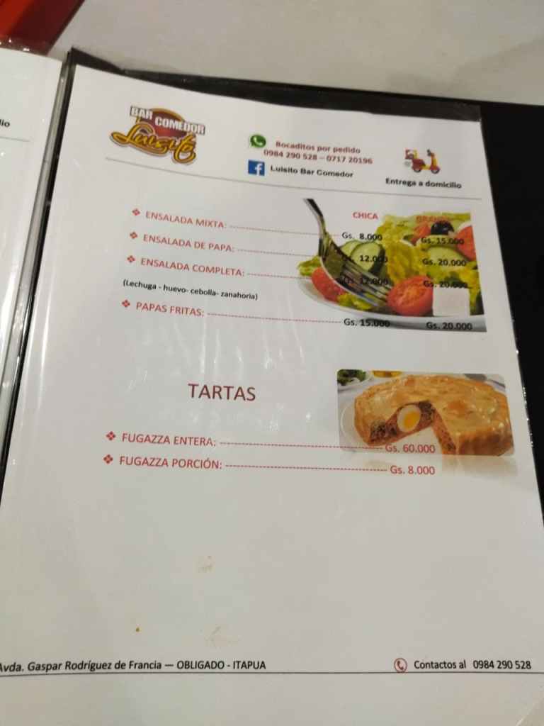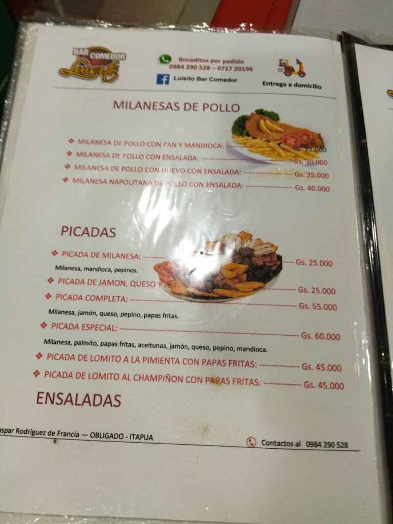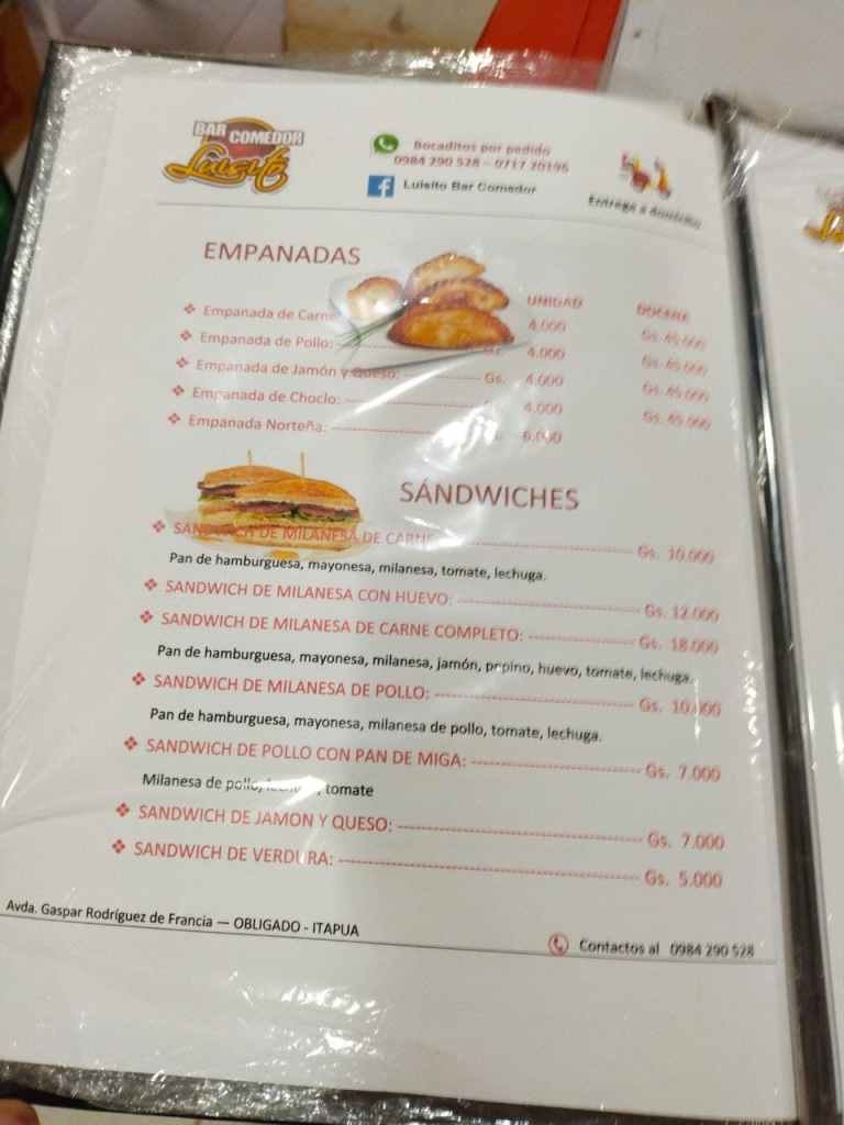 Essen bestellen in Paraguay ist eigentlich sehr einfach. Fast jeder Anbieter wickelt auch über Whatsapp Bestellungen ab, die Handynummern sind meist prominent am Restaurant ausgehängt oder auf deren Facebookseiten genannt. Wenn einem die Speisekarte vorliegt (nicht unbedingt ist sie online einsehbar), kann man also mit freundlicher Unterstützung eines Online-Übersetzers seine Bestellung in bestes Spanisch gießen und die spanische Antwort bei Bedarf auch in Ruhe übersetzen.