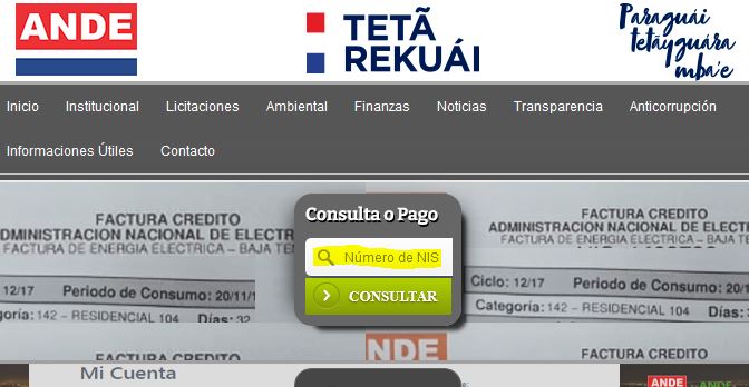 Auf der Website des staatlichen Stromanbieters ANDE kann man sich monatlich die Rechnung herunterladen. Hierfür benötigt man seine persönliche NIS-Nummer, die man den Stromrechnungen der Voreigentümer entnehmen kann bzw. die man bei der Anmeldung seines Stroms erhält. Diese Número de NIS gibt man auf der Seite ein und gelangt so zu seiner Rechnungsübersicht.