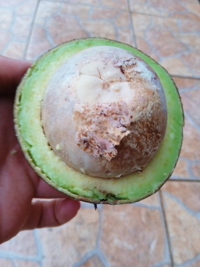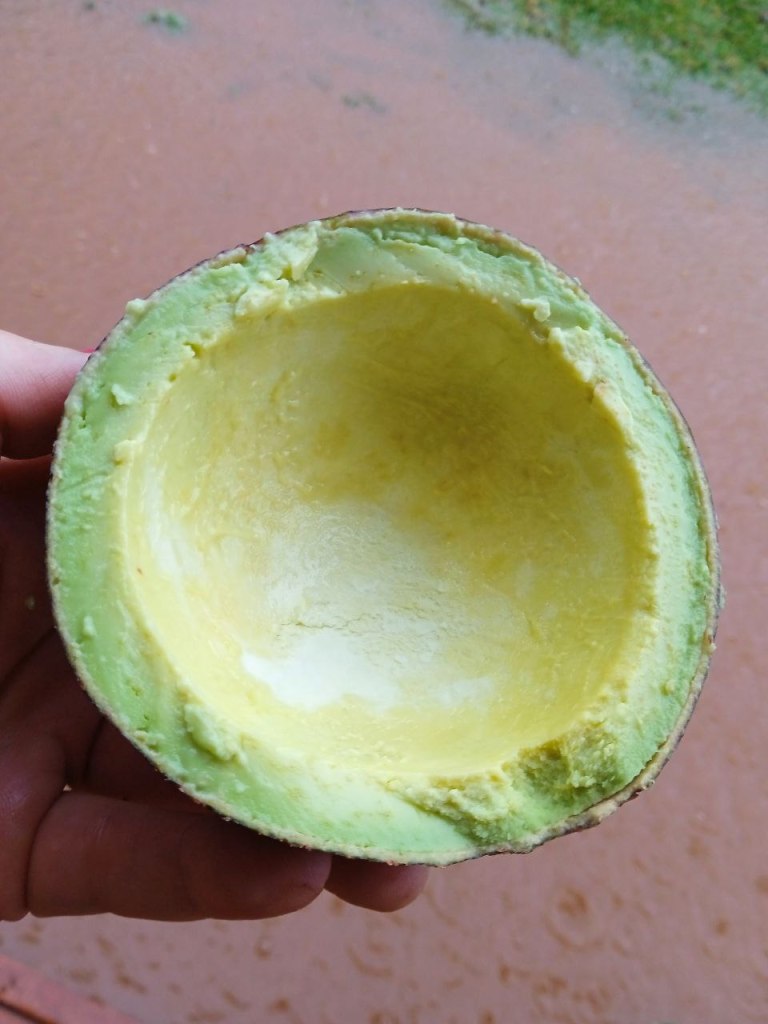 Was an den hiesigen Avocados im Unterschied zu den in Europa auffällt, ist, daß sie rund statt oval und auch zumeist größer sind. Dafür aber ist ihr Kern vergleichsweise groß. So bekommt man aus einer großen paraguayischen Aguacate wohl in etwa so viel Fruchtfleisch heraus wie aus einer mittleren in Deutschland erstandenen Avocado.