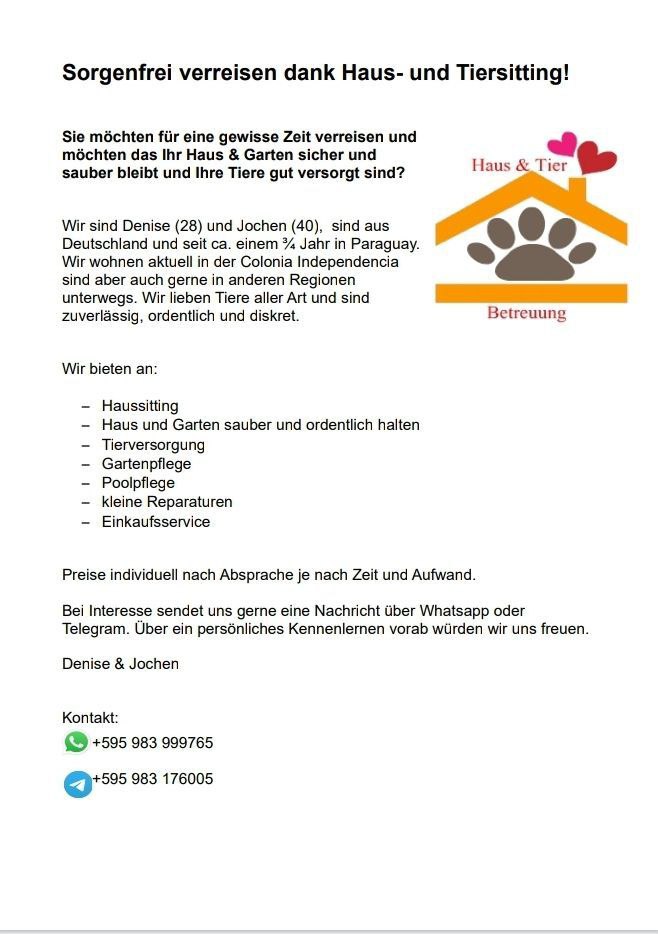 Über eine Kleinanzeige haben wir den richtigen Mann dafür gefunden: Jochen aus Independencia. Er bietet mit seiner Partnerin Denise Haussitting und Tiersitting in ganz Paraguay an. Nach Absprache übernehmen die beiden dann auch gleich die Poolpflege, Gartenarbeit oder einen Einkaufsservice.