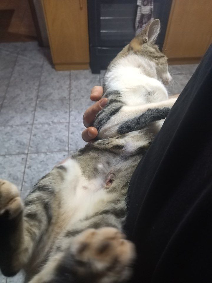 15 Tage später sollten wir vereinbarungsgemäß zum Fädenziehen in die Praxis kommen. Und wie es manchmal im Leben so kommt – am Abend des 14. Tages, quasi kurz vor der Ziellinie, der Schock: Tigis Naht war aufgegangen. Wir riefen trotz der späten Stunde panisch die Tierärztin an und schickten ein Foto von Tigis Bauch. Sie beruhigte uns, daß bis zum nächsten Morgen nichts passieren würde und wir mit dem antibiotischen Spray desinfizieren sollten.
