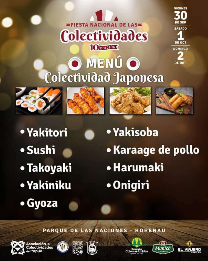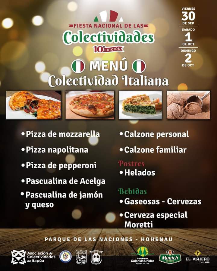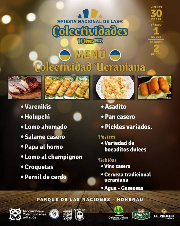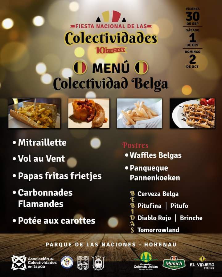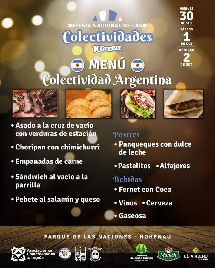 Für das leibliche Wohl wird mehr als gut gesorgt sein. Denn jede colectividad bietet eine große Auswahl an landestypischen Speisen, Getränken und Nachspeisen an. Die Besucher werden an den drei Festtagen die Qual der Wahl haben, sich zu entscheiden zwischen deutschem Jägerschnitzel, italienischer Pizza, Schweizer Raclette, belgischen Waffeln, japanischem Sushi, argentinischem Asado, ukrainischen Varenikis, polnischen Würsten, brasilianischen Grillspießen, Sopa Paraguaya und vielem mehr.