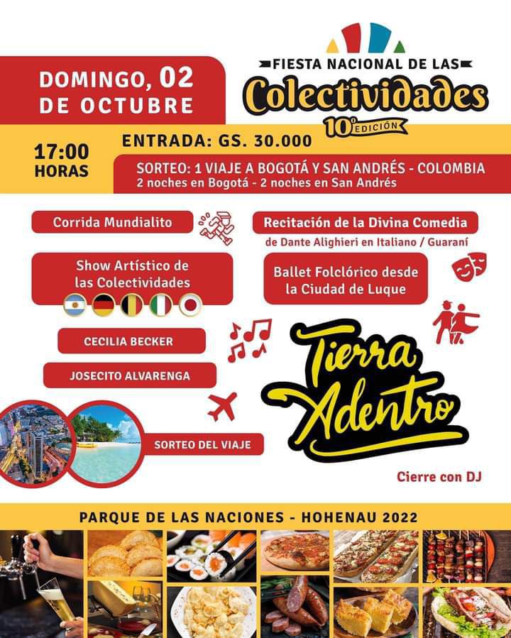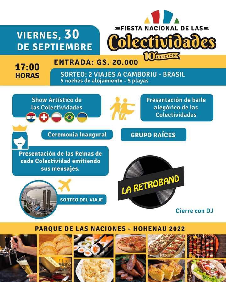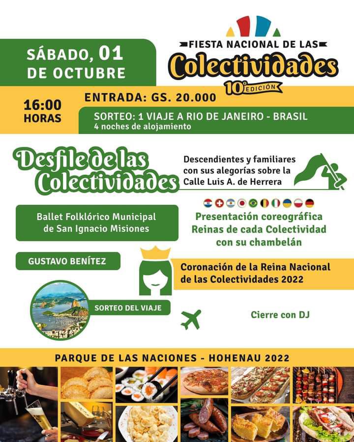 Am letzten Septembertag wird der Parque de las Naciones zum zehnten Mal Schauplatz der Fiesta Nacional de las Colectividades sein. Die Fiesta richten alle zehn colectividades gemeinsam aus. Alle Häuser und der gesamte Park werden festlich geschmückt sein. Drei Tage lang, Freitag bis Sonntag, öffnet der Park seine Tore. Einlass ist um 17 Uhr bzw. am Sonntag um 16 Uhr. Auf dem Programm stehen verschiedene künstlerische Darbietungen und Musikauftritte aus dem reichen Brauchtums- und Kulturschatz der beteiligten Nationen, darunter Folkloreballett oder Dantes Göttliche Komödie auf Italienisch und Guaraní.