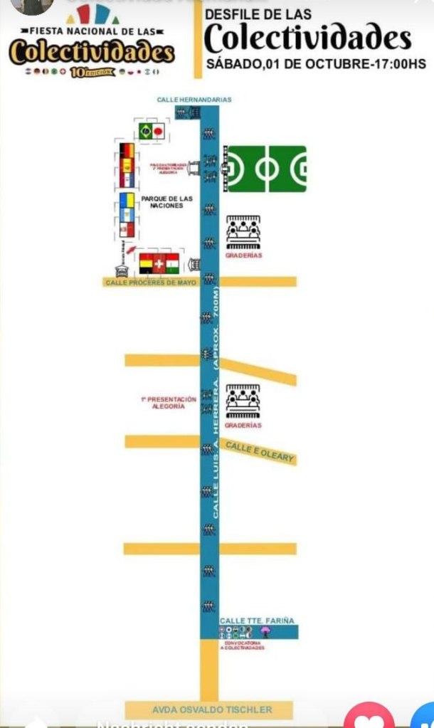 Um 17 Uhr startet der Desfile der zehn beteiligten Nationen durch die Calle Luis A. Herrera in Hohenau. Die colectividades laufen in landestypischer Tracht und fahnenschwingend in der Parade und zeigen die Vielfalt der in Hohenau angesiedelten Nationen.