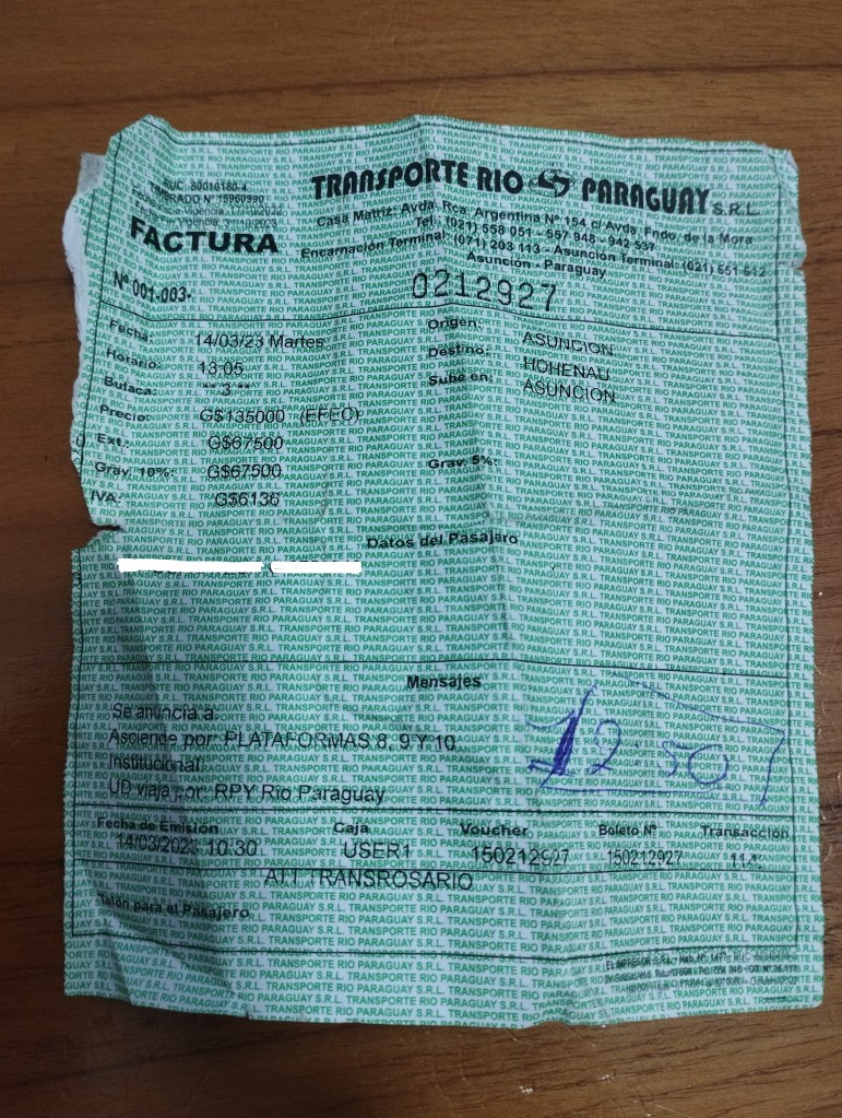 Im Obergeschoss befindet sich der Ticketverkauf. Der nächste Bus mit „Rio Paraguay“ ging um 13:00 für 135.000 GS (ca. 19$). Der Schalter von „Rio Paraguay“ ist die Treppe hoch und gleich rechts.