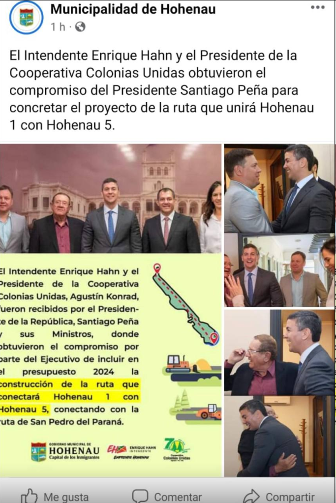 Der Bürgermeister Enrique Hahn und der Präsident der Cooperativa Colonias Unidas, Augustin Konrad, wurden vom Präsidenten der Republik, Santiago Pena, und seinen Ministern empfangen, wo sie die Zusage der Exekutive erhielten, den Bau der Straße, die Hohenau 1 mit Hohenau 5 verbindet und an die Straße nach San Pedro del Parana anschließt, in den Haushalt 2024 aufzunehmen.